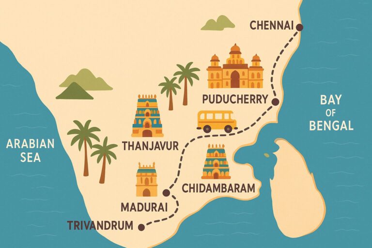 Madurai to Thanjavur | 3.5 hours | We’ll travel in the morning, giving us time in the afternoon to visit the Brihadeeswara Temple, Thanjavur Royal Palace, and Gangaikonda Cholapuram. Thanjavur is a beautiful little town with a rich royal history surrounded by rice paddies.
